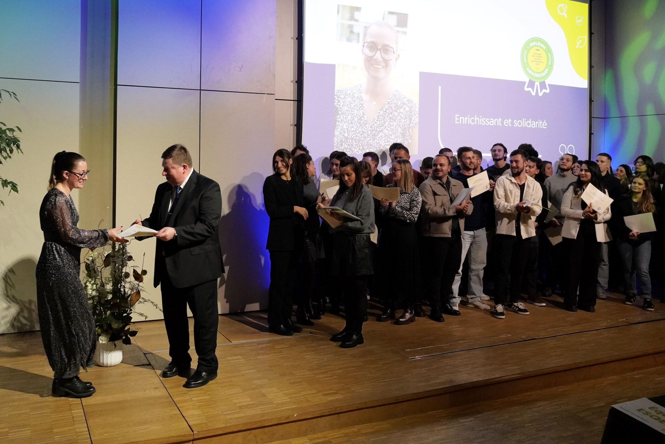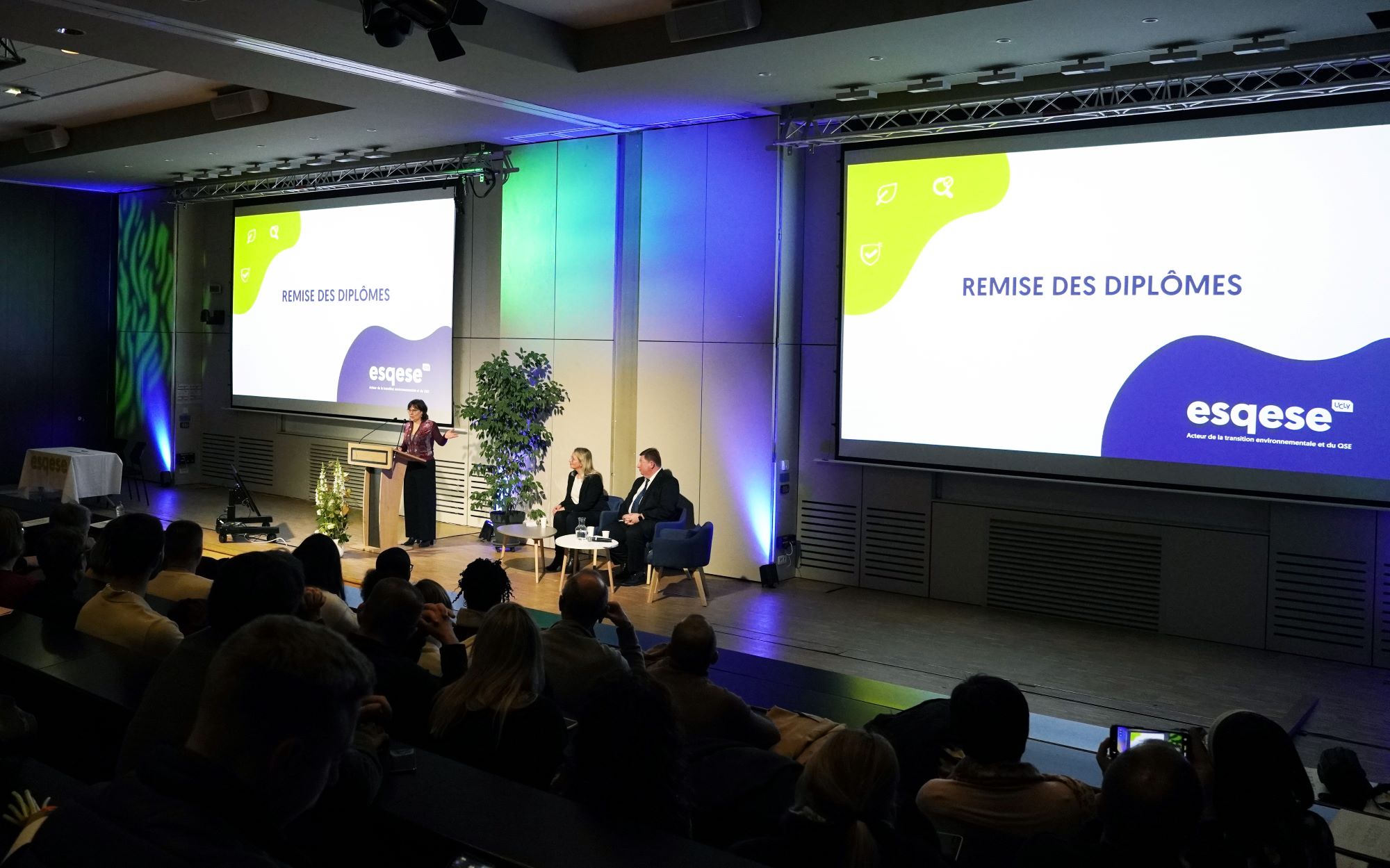 La cérémonie s’est tenue en présence de Stephane Chabrier, Directeur Qualité, Risques et Excellence opérationnels du Groupe APICIL et parrain de la cérémonie, de Marie Bui-Leturcq, Vice-rectrice chargée de la Transition Socio-Ecologique, de la Qualité et des Relations et de Cathy Grosjean, Directrice de l'ESQESE, qui ont salué l’engagement et la réussite des diplômés.